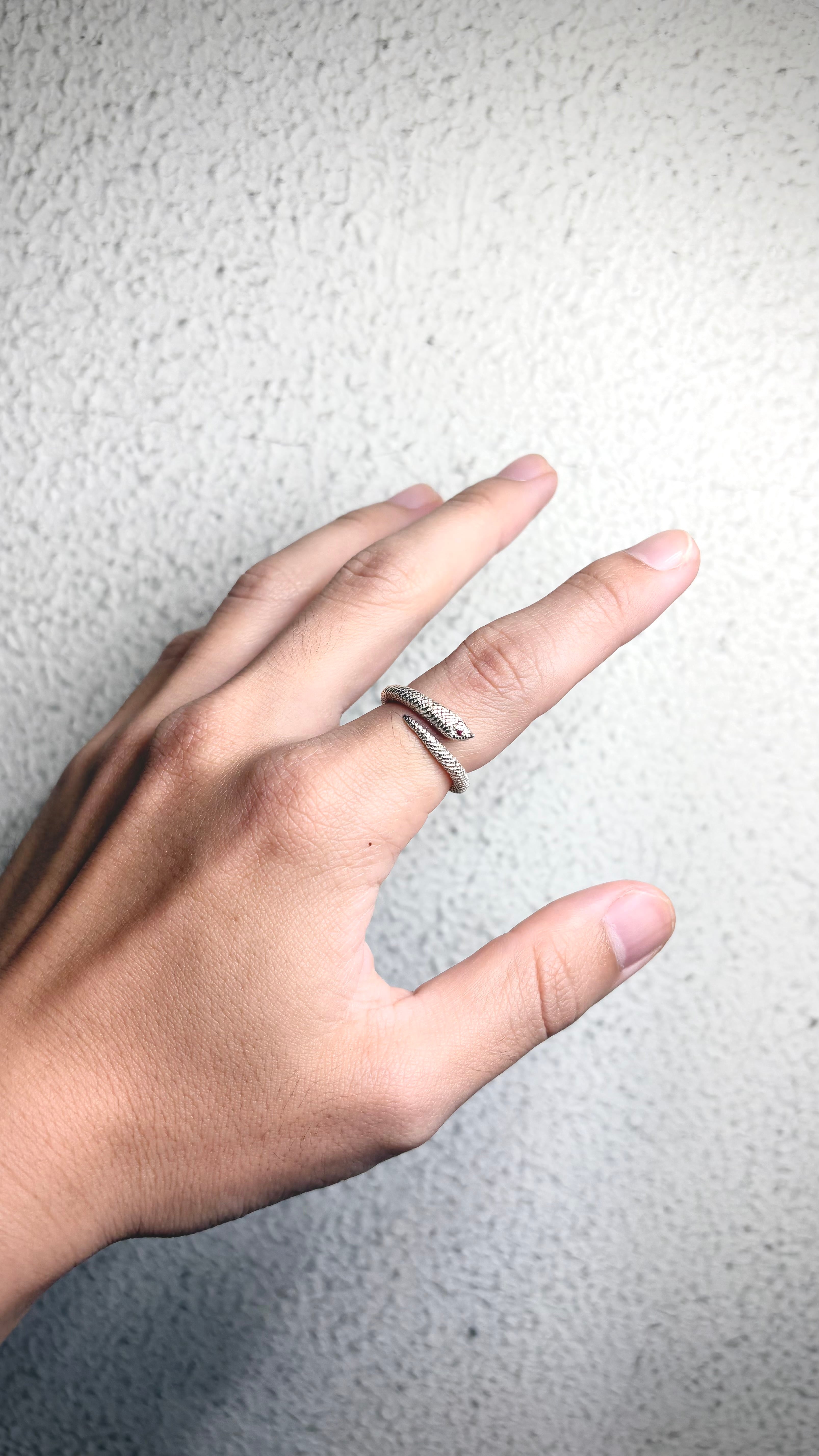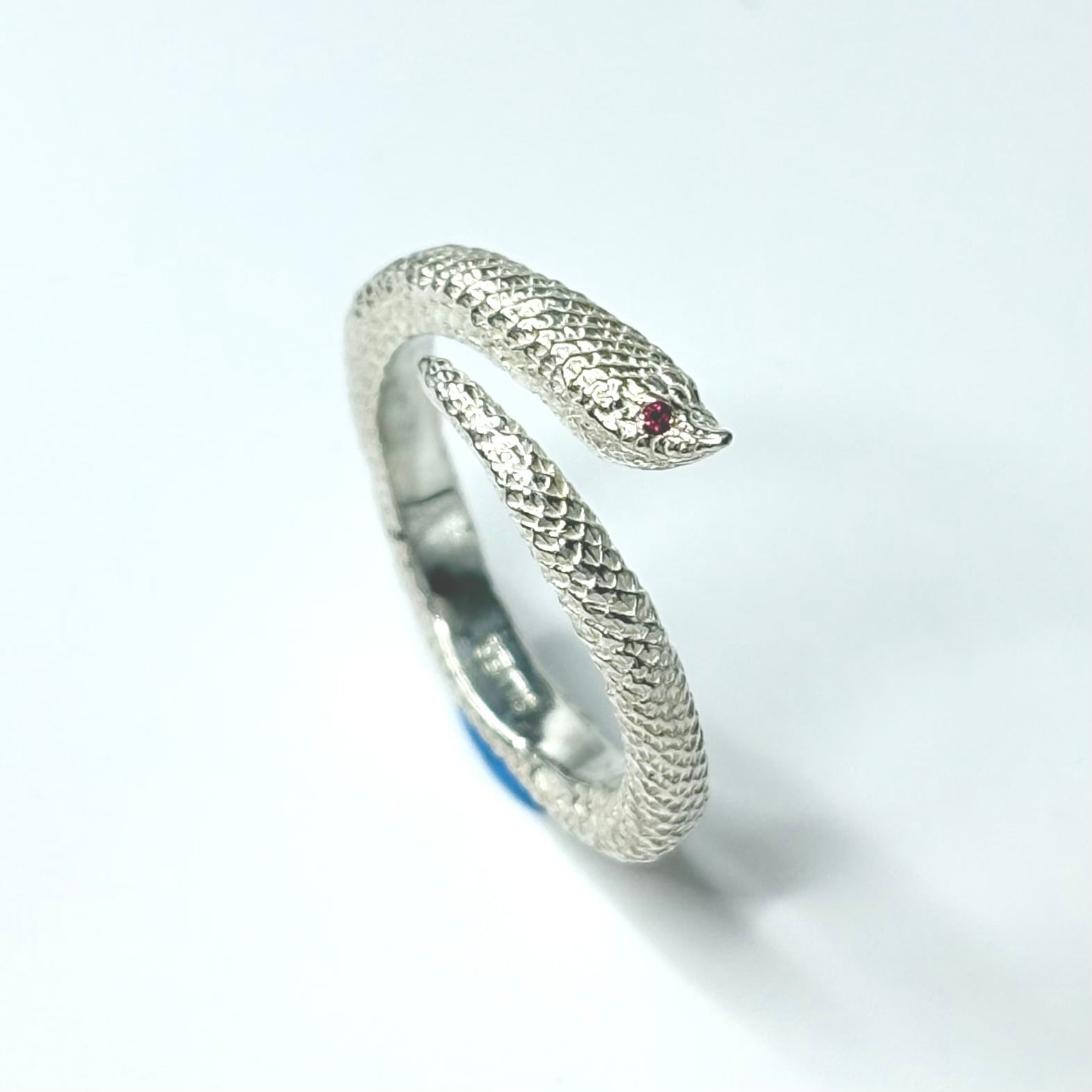 白仕上げのシシバナヘビリングSの目に7月の誕生石であるルビーを入れたカスタム品。