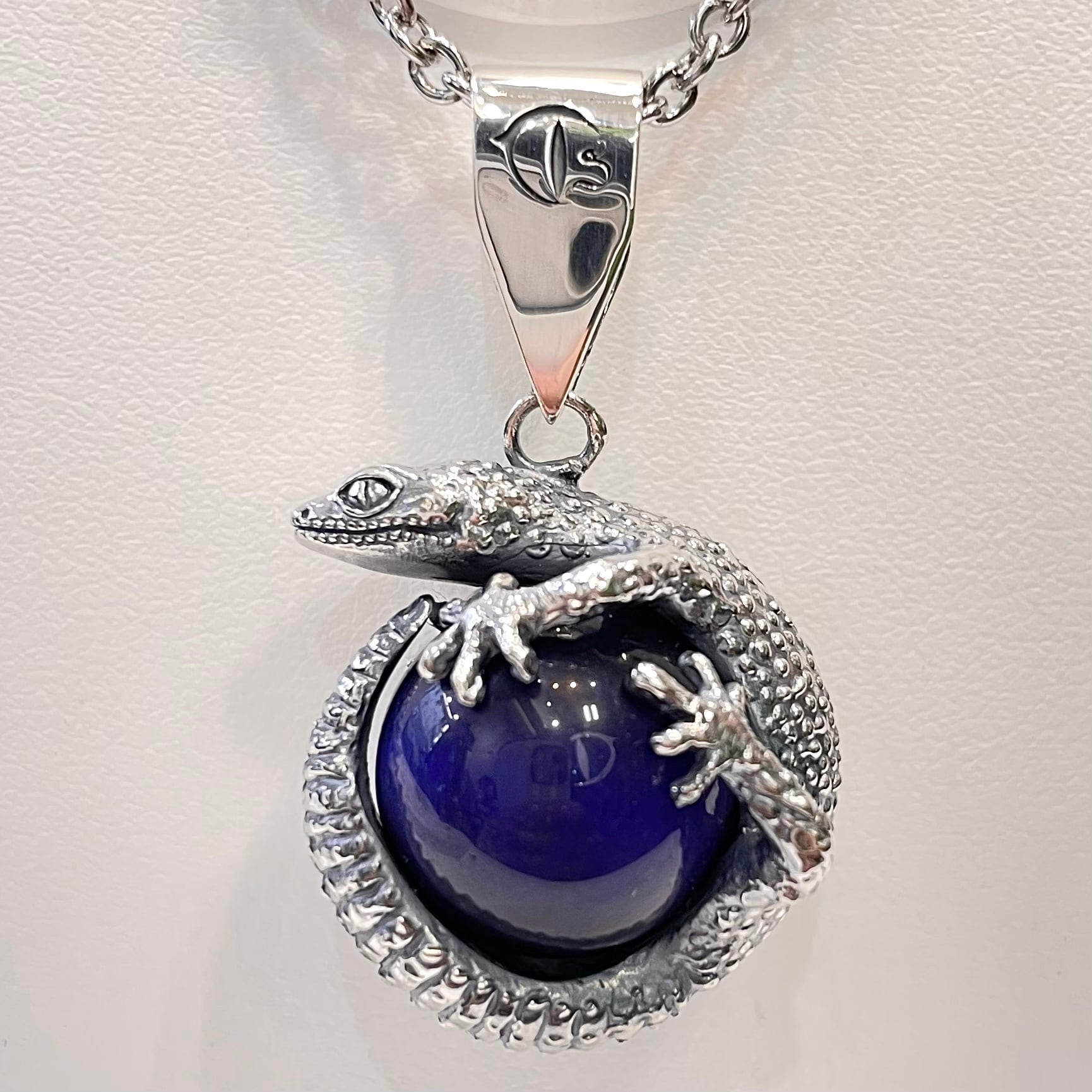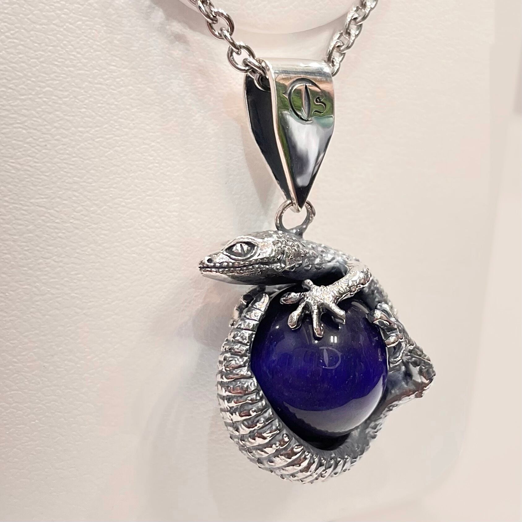 レオパードゲッコーが天然石を抱いているペンダント。