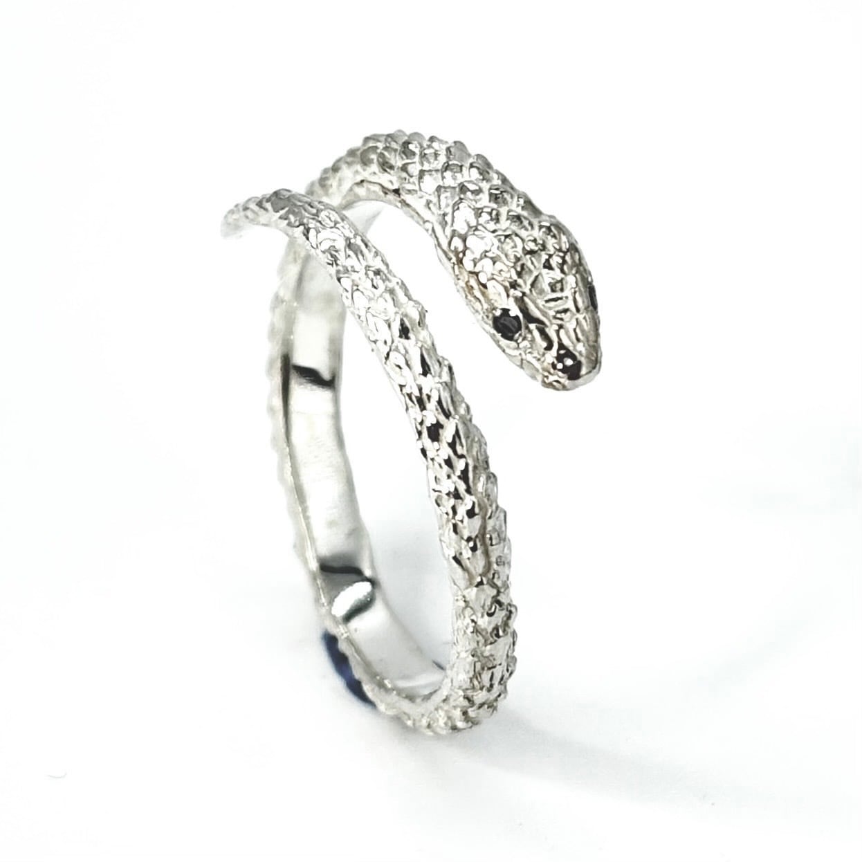 白仕上げのコーンスネークリングSの目にブラックダイヤを入れたカスタム品。