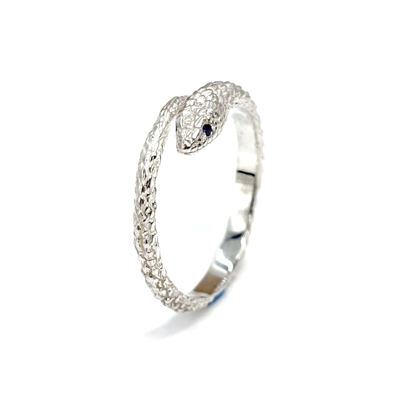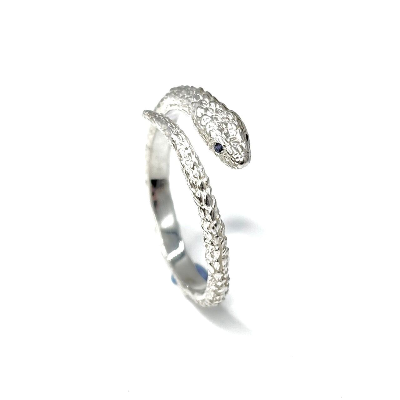 白仕上げのコーンスネークリングSの目にサファイヤを入れたカスタム品。