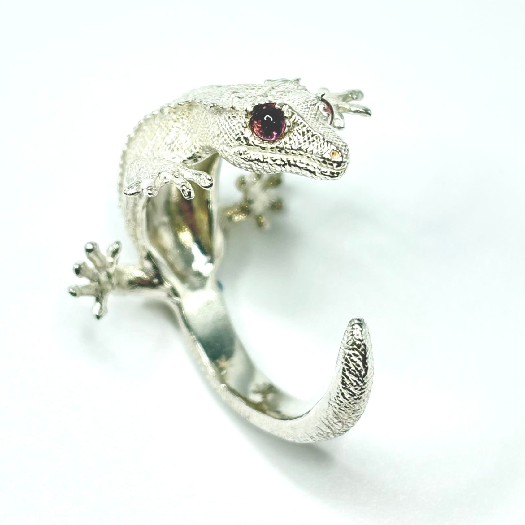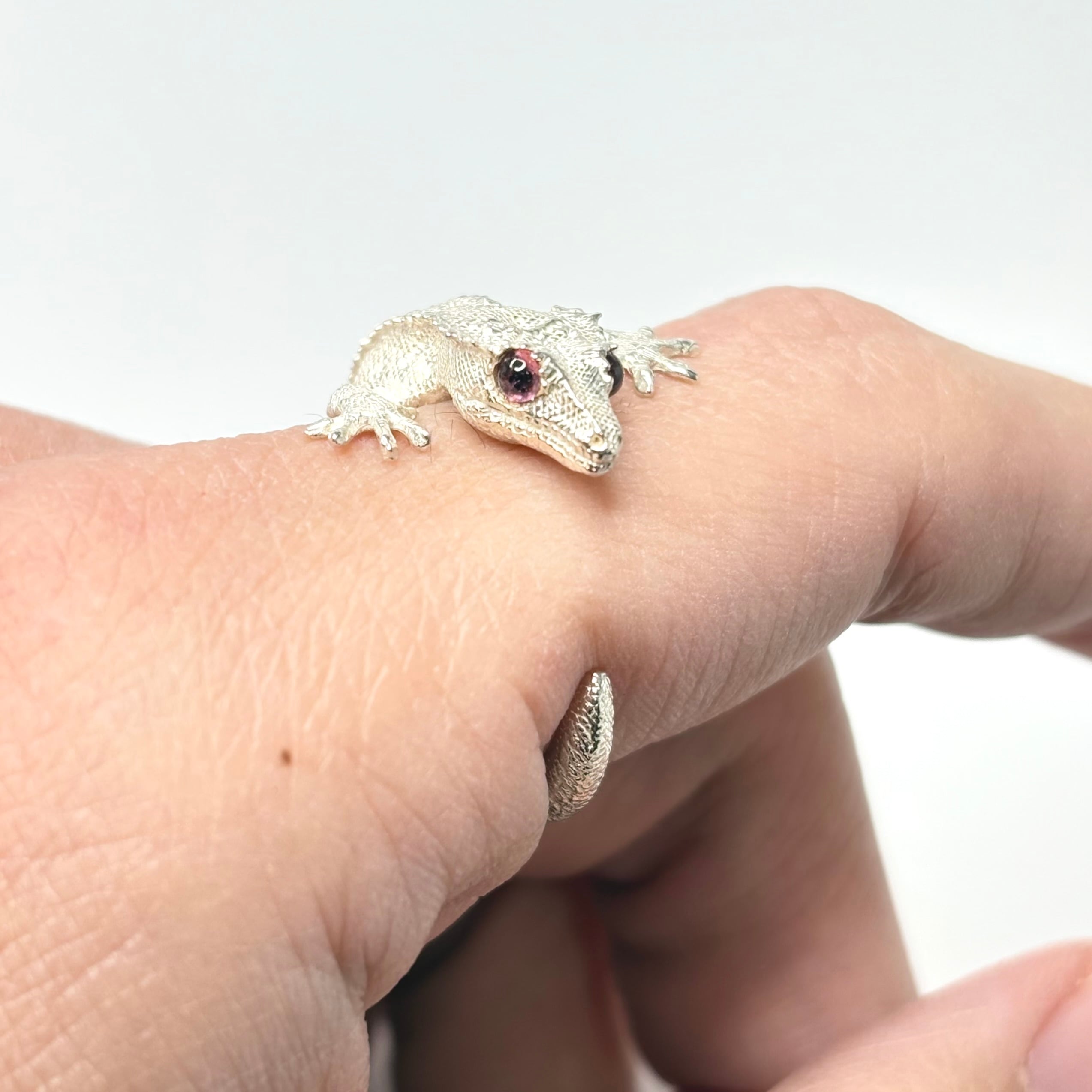 白仕上げのクレステッドゲッコーリングの目に天然石のピンクトルマリンを埋めこみました。